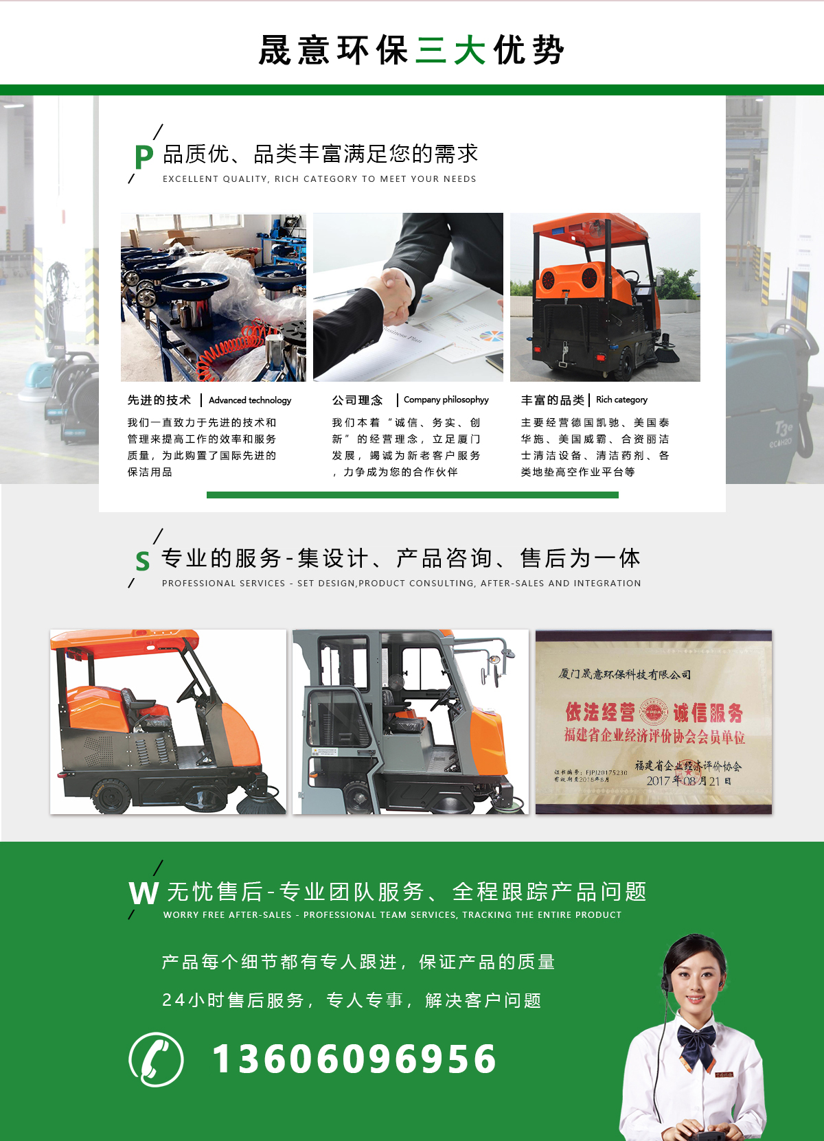 我司是2003年開始專業從事清潔設備銷售與石材護理保養服務為一體的綜合性公司。主要經營德國凱馳、美國泰華施、美國威霸、合資麗潔士清潔設備、清潔藥劑、各類地墊、高空作業平臺等。供應、酒店、大型工廠、物業等單位使用。目前我司服務的四、五星級酒店超過100家如艾美酒店、喜來登酒店、溫德姆、郎豪等國家國內連鎖品牌。廈門國家電網、七匹狼、鴻星爾克等是我司常年保潔單位。銷售產品:廈門洗地機、廈門掃地機、廈門石材護理、保潔設備、...
